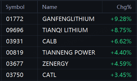 Lithium battery stocks jumped in Hong Kong. Ganfeng Lithium and Tianqi Lithium rose 9%; CALB rose 7%; Zenergy rose 5%; Tianneng Power and CATL rose 4%.