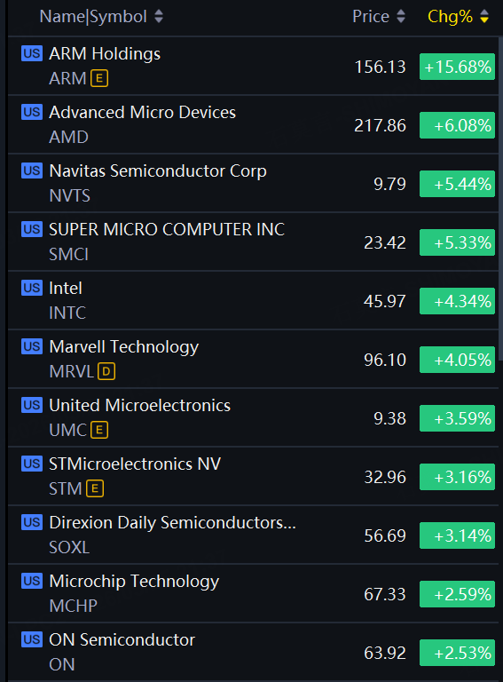 Chip stocks rallied on Wednesday. ARM Holdings up 15.7%; AMD up 6%; Navitas, SMCI up 5%; Intel, Marvell up 4%.