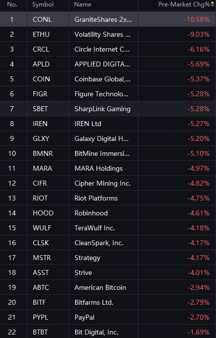 Crypto Stocks Drop. Circle down 6%; IREN, Coinbase, BitMine and MARA Holdings fell 5%; Riot, Robinhood and Strategy fell 4%.