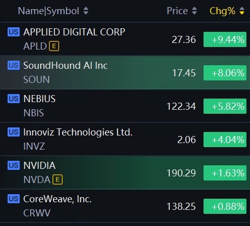 Nvidia-Linked Shares Rally. Applied Digital up 9%; SoundHound AI up 8%; NEBIUS up 6%; Innoviz up over 4%
