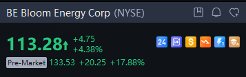 The stock rose 18% in premarket trading following the release of third quarter earnings. Bloom Energy (BE) beat analyst expectations for revenue and earnings. Quarterly revenue stood at $519 million against a consensus estimate of $428 million, according to FactSet. Adjusted earnings were 15 cents per share compared an expected 10 cents. Standard earnings per share netted out to a loss of 10 cents apiece.