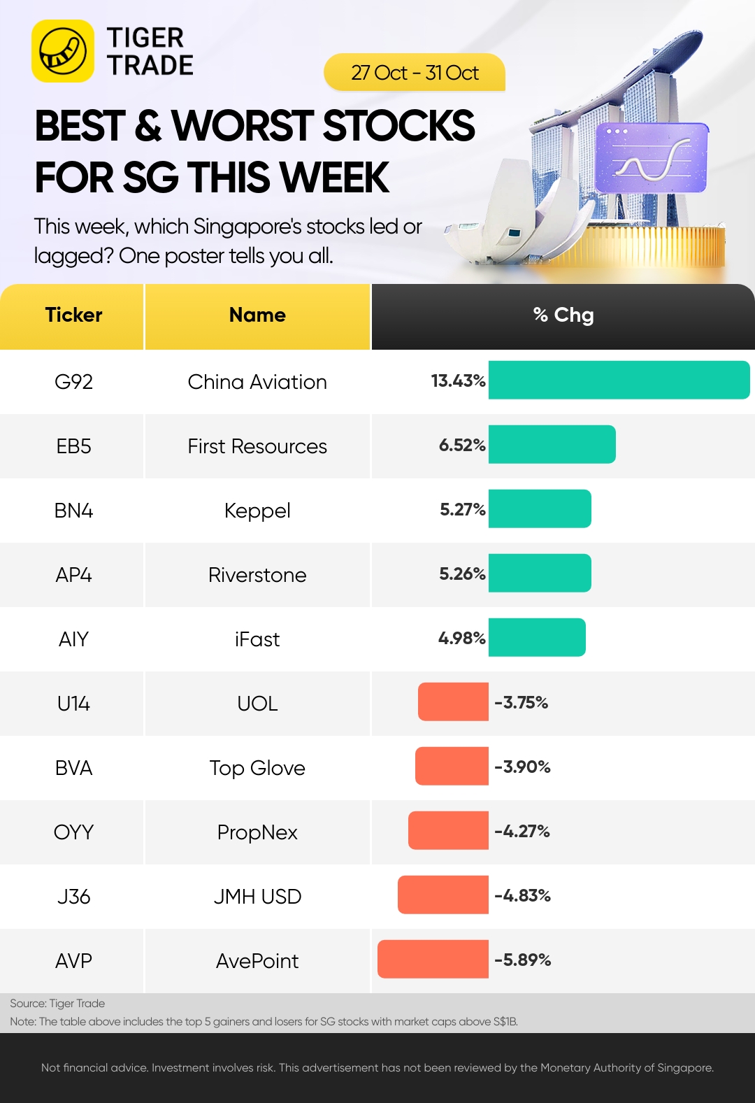 In terms of individual stocks, China Aviation surged over 13%; First Resources gained over 6%; Keppel, iFast rose around 5%; AvePoint down nearly 6%; JMH USD, PropNex down over 4%.