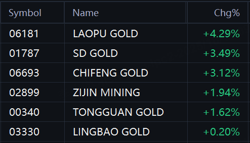 Gold stocks jumped in Hong Kong. Laopu Gold and SD Gold rose 4%; Chifeng Gold rose 3%; Zijin Gold International, Zijin Mining, and Tongguan Gold rose 2%.