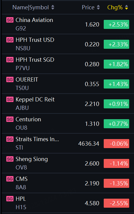 Singapore shares closed lower on Wednesday. STI down 0.06%; China Aviation, HPH Trust up over 2%; OUEREIT, Keppel DC Reit up about 1%; Sheng Siong, CMS down over 1%.