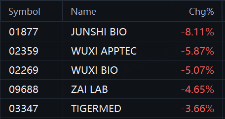 Biomedical stocks declined in Hong Kong. Junshi Biosciences fell 8%; WuXi AppTec fell 6%; WuXi Biologics and Zai Lab fell 5%; Tigermed fell 4%.