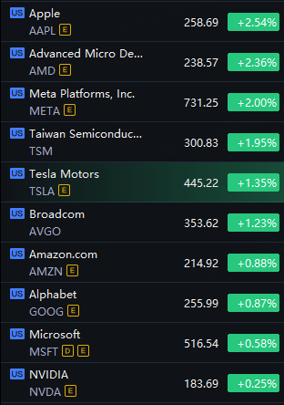 Mega Growth Stocks Gained. Apple, AMD and Meta up 2%; TSMC, Tesla And Broadcom up 1%; Amazon up 0.9%.