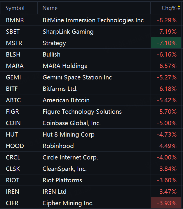 Crypto stocks sank in morning trading on Monday. BitMine fell 8%; SharpLink Gaming, Strategy, and MARA Holdings fell 7%; Bitfarms fell 6%; Coinbase and Hut 8 fell 5%; Robinhood, Circle, Cipher Mining, CleanSpark, Riot Platforms, and IREN fell 4%.