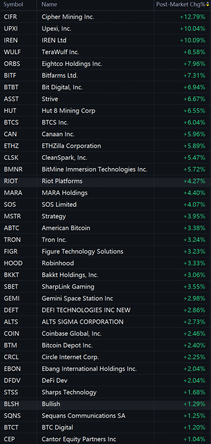 Crypto stocks jumped. Cipher Mining rose 13%; IREN rose 10%; TeraWulf rose 9%; Bitfarms and Bit Digital rose 7%; BitMine rose 6%; Riot Platforms, MARA Holdings, Strategy rose 4%; Coinbase rose 3%.