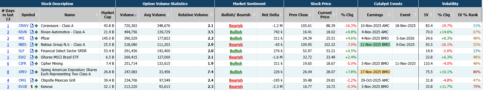 A total number of 721.88K options related to CoreWeave were traded on Tuesday, up 72% from the previous trading day, of which call options accounted for 58%. Particularly high volume was seen for the $90 strike put option expiring Nov. 14, with 22,812 contracts trading. $CRWV 20251114 90.0 PUT$