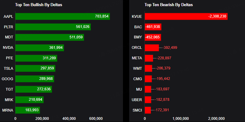 This report shows stocks with the highest volume of bullish and bearish activity by option delta volume, which converts option volume to an equivalent stock volume (bought or sold).