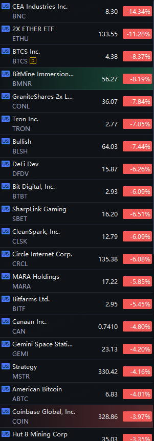 Crypto stocks fell in morning trading. CEA down 14%; BMNR and BTCS down 8%; Tron and Bullish down 7%; Circle and MARA fell 6%.