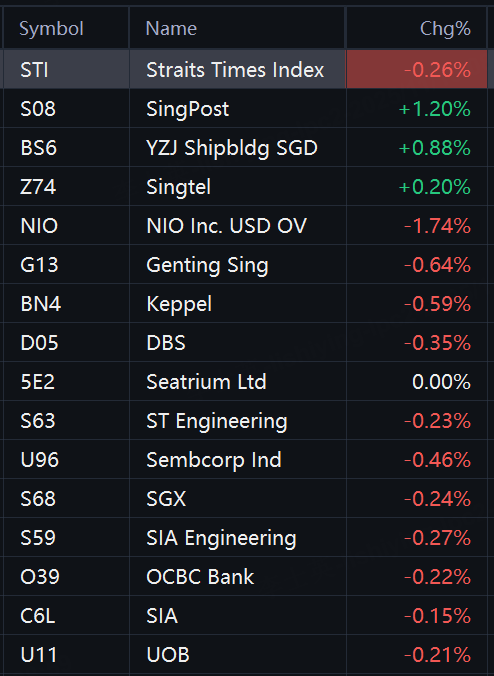 Singapore stocks opened lower on Tuesday. STI fell 0.3%; SingPost rose 1.2%; Yangzijiang Shipbuilding rose 0.9%; Singtel rose 0.2%; NIO fell 2%; DBS fell 0.4%.