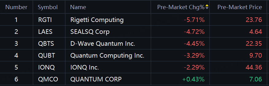 Quantum shares slid in premarket trading. Rigetti Computing down nearly 6%; SEALSQ, D-Wave Quantum down over 4%; Quantum Computing down over 3%.