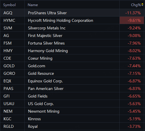 AGQ down 11%; Hycroft Mining down 10%; First Majestic Silver down 9%; Harmony Gold, Coeur Mining down 8%; Pan American Silver down 7%.