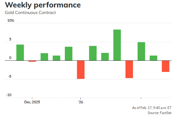 While paring a bigger, earlier loss, gold futures were still down 2.4% at $4,872 an ounce, after gaining 1.43% last week to finish at $5,022 an ounce. The precious metal has gained 8 of the past 10 weeks.
