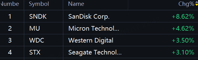 US Storage Shares Rise; SanDisk up over 8%; Micron up over 4%; Western Digital and Seagate up 3%.