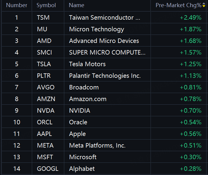 Big tech stocks jumped in premarket trading. TSMC, Micron up around 2%; AMD, SMCI, Tesla, Palantir, Broadcom up about 1%.