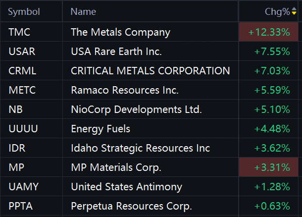 Rare earth stocks jumped in morning trading. The Metals Company rose 12%; USA Rare Earth rose 8%; Critical Metals rose 7%; Ramaco Resources rose 6%; NioCorp Developments and Energy Fuels rose 5%; Idaho Strategic Resources rose 4%; MP Materials rose 3%.