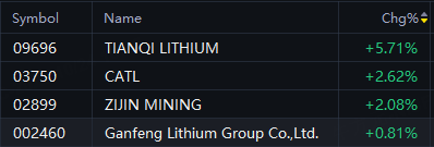 Tianqi Lithium rose 6%; CATL rose 3%; Zijin Mining rose 2%; Ganfeng Lithium rose 1%.