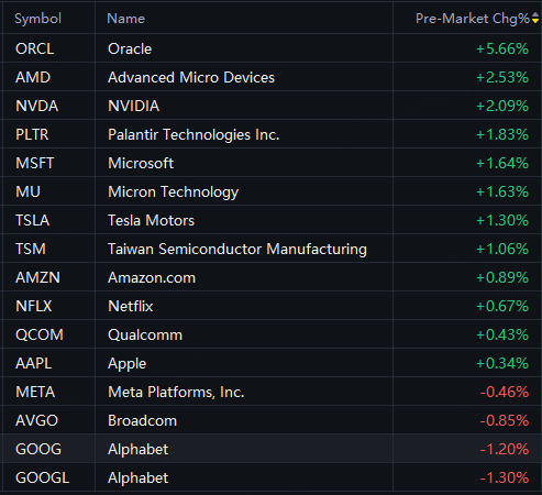 Big tech stocks were mixed in premarket trading on Wednesday. Oracle rose 6%; AMD rose 3%; Nvidia, Microsoft, Micron, Palantir rose 2%; Tesla, TSMC, Amazon rose 1%; Alphabet, Broadcom fell 1%.