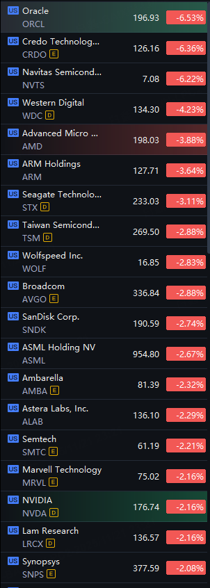 Chip Stocks Extend Losses. Oracle, Navitas and Credo down 6%; Western Digital and AMD down 4%; ARM, Seagate, Broadcom and TSMC down 3%.