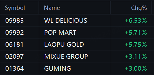 New consumption stocks jumped in Hong Kong. Weilong Delicious rose 7%; Laopu Gold and Pop Mart rose 6%; Mixue Group and Guming rose 3%.