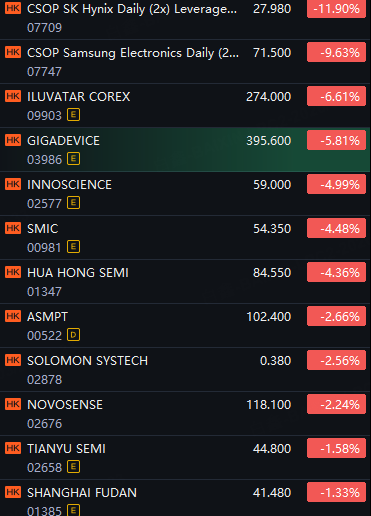 HK Chip Stocks And ETFs Dropped. SK Hynix-Related ETF Down 12%; Samsung-Related ETF Down 10%; Iluvatar Corex Down 7%; Gigadevice Down 6%; InnoScience Down 5%; SMIC And Hua Hong Semi Down 4%.