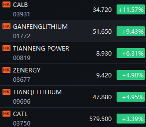 HK Lithium Stocks Surge; CALB Up 12%; Ganfenglithium Up 9%; Tianfeng Power Up 6%; Zenergy And Tianqi Lithium Up 5%; CATL Up 3%