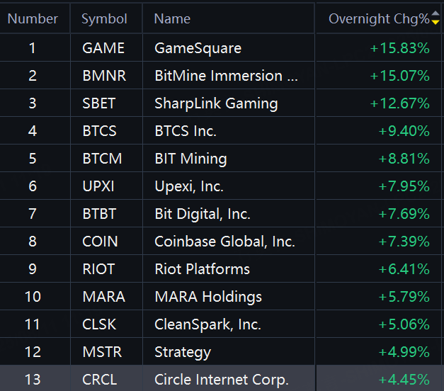 Crypto shares extended gains in overnight trading as bitcoin rose above $122,000. GameSquare, BMNR up over 15%; SBET up nearly 13%; BTCS, BTCM up 9%; Upexi up 8%.