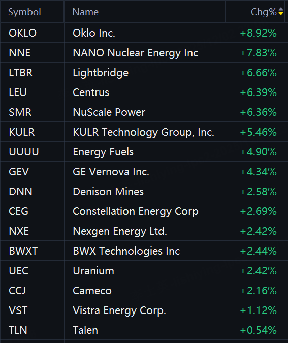 Nuclear energy stocks jumped in morning trading. Oklo rose 9%; NANO Nuclear Energy rose 8%; Lightbridge rose 7%; Centrus, NuScale Power, and KULR Technology rose 6%; Energy Fuels rose 5%; GE Vernova rose 4%.