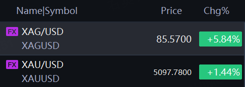 Spot silver rose 5.84% to $85.57 per ounce; spot gold rose 1.44% to 5,097.78 per ounce.