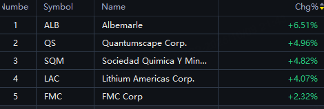 Lithium Miners Gained. Albemarle up 6%; Quantumscape, Sociedad Quimica and Lithium Americas up 4%; FMC up 2%.