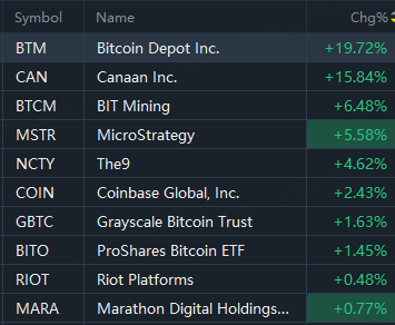 Crypto stocks gained in morning trading. Bitcoin Depot rose 20%; Canaan rose 16%; MicroStrategy rose 6%; Coinbase rose 2.4%.
