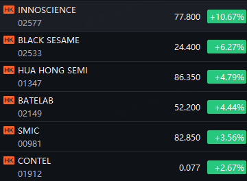 The HK chip stocks rally; INNOSCIENCE TECHNOLOGY surging nearly 11%; BLACK SESAME INTELLIGENCE rising over 6%; Hua Hong Semiconductor up 5%; Batelab up 4%; SMIC up 3%; Contel up 2%.