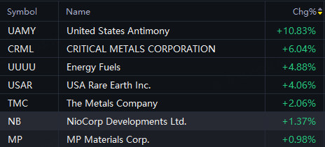 UAMY up 11%; Critical Metals up 6%; Energy Fuels up 5%; USA Rare Earth up 4%; MP Materials, NioCorp up 1%.
