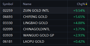 Zijin Gold rose 10%; Chifeng Gold up 6%; Lingbao Gold up 5%; China Gold Intl up 4%.