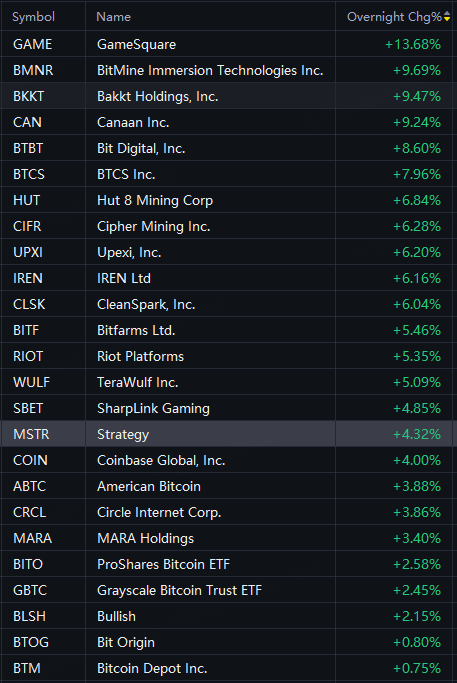 GAME rose 14%; BMNR rose 10%; BTBT, Canaan up 9%; BTCS rose 8%; Bitfarms, SBET rose 5%; Strategy, Coinbase rose 4%.