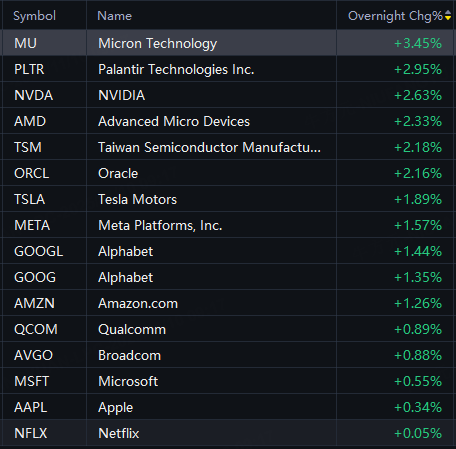 Big tech stocks rose in overnight trading. Nvidia, Micron, Palantir up 3%; AMD, Tesla, TSMC rose 2%.