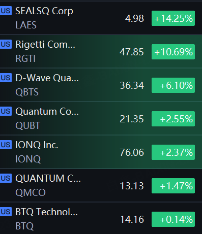 Quantum Shares Kept Rally. LAES up 14%; Rigetti up 11%; D-Wave Quantum up 6%; QUBT and IONQ up 2%.