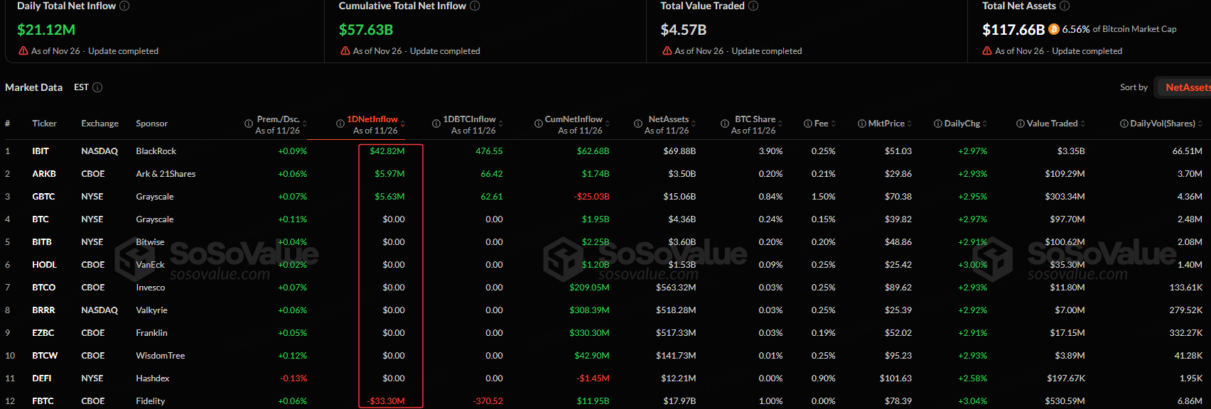 The Bitcoin spot ETF with the highest net inflow on Nov. 26 was iShares Bitcoin Trust , with a net inflow of $42.82 million. Followed by ARK 21Shares Bitcoin ETF, with a net inflow of 5.97 million, according to SoSoValue.