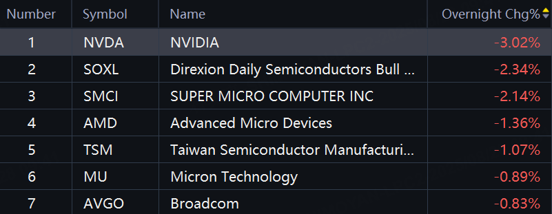 Chip stocks fell in overnight trading after Nvidia’s earnings. SOXL, Super Micro fell over 2%; AMD, TSMC fell over 1%; Micron, Broadcom fell within 1%.