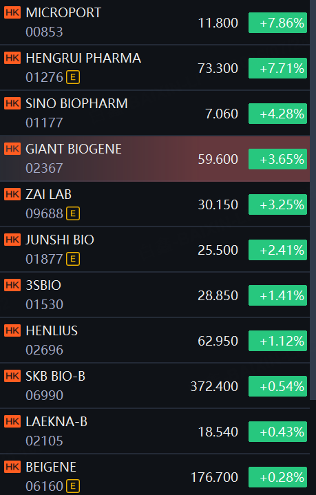 HK pharma stocks shined. Microport and Hengrui Pharma up 7%; Sino Biopharm up 4%; Zai Lab up 3%.