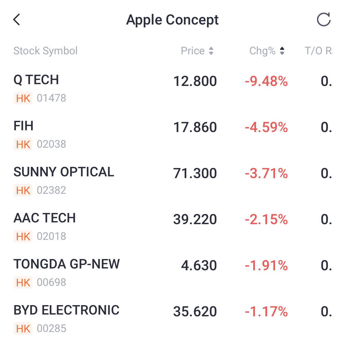 Apple Concept shares fell on Tuesday. Q Tech down over 9%; FIH down over 4%; Sunny Optical down over 3%; AAC Tech, Tongda GP-New down around 2%; BYD Electronic down over 1%.