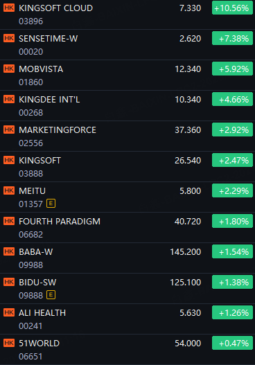 Some HK AI App Stocks Shined. KingSoft Cloud up 11%; SenseTime up 7%; Mobvista up 6%; Kingdee up 5%; MarketingForce, Kingsoft and Meitu up 2%.