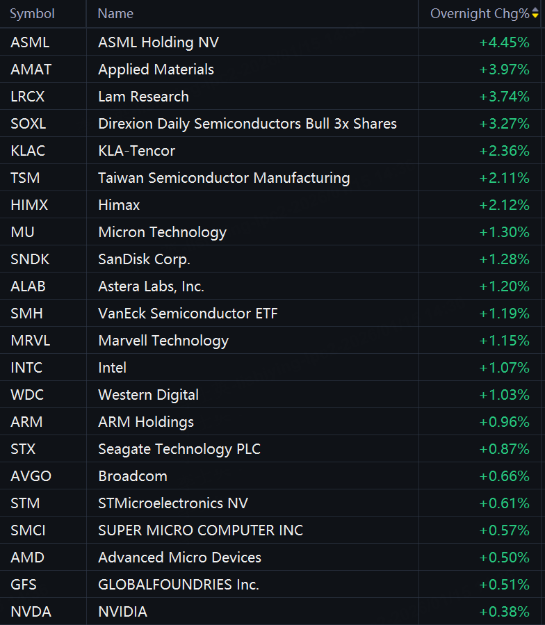 Semiconductor stocks gained in overnight trading, as TSMC said its capital expenditure would be higher over the next three years and forecasts 2026 capex of $52 billion to $56 billion.