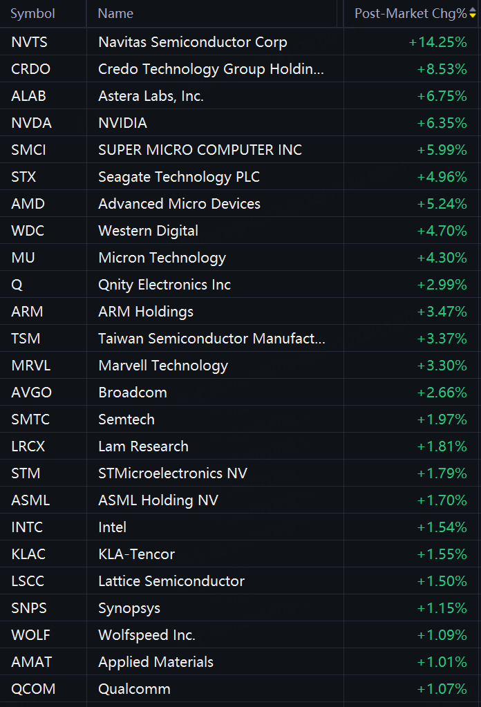 chip stocks jumped. Navitas Semiconductor rose 14%; Credo Technology rose 9%; Super Micro Computer rose 6%; AMD, Seagate Technology, and Western Digital rose 5%; Micron rose 4%; TSMC rose 3%.