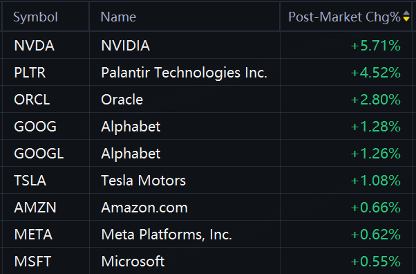 Big tech stocks gained. Nvidia rose 6%; Palantir rose 5%; Oracle rose 3%; Alphabet and Tesla rose 1%.