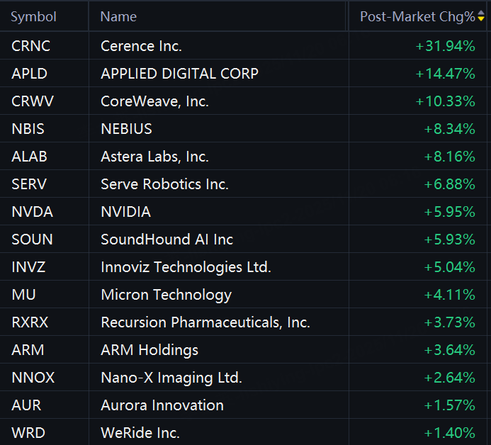 Nvidia-related stocks jumped. Cerence rose 32%; Applied Digital rose 15%; CoreWeave rose 10%.