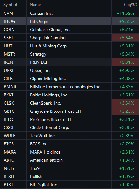 Canaan rose 12%; Bit Origin rose 10%; Coinbase rose 6%; Strategy, IREN rose 5%; BMNR rose 4%; Circle up 3%.