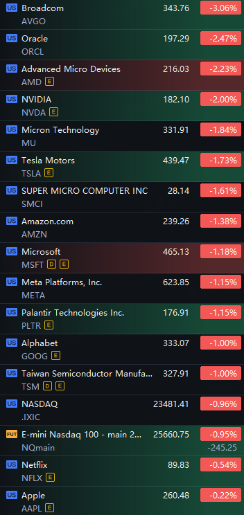 Big Tech Stocks Drop. Broadcom down 3%; Oracle, Nvidia and AMD down 2%; SMCI, Tesla, Micron, Meta, Alphabet, Palantir, Amazon and TSMC down 1%.